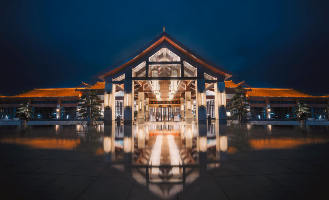 9#樓與8#樓互成犄角之勢,主要功能為酒店大型宴會之所,同樣為扇形建筑體、網架鋼結構屋面。通透的山水畫沖孔鋁單板輔以木紋造型鋁板包梁,述說著貴州山水的靈性,也貫穿延續了整體建筑風格。