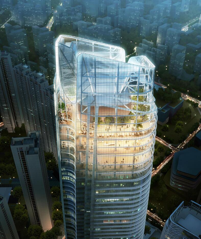 該項目是華僑城集團投資建設的第一個超高層全異形單元式幕墻,整體造型復雜、穿插疊合、相互連接,且幕墻系統分散,工作面廣,施工難度系數極高,為國內首例。