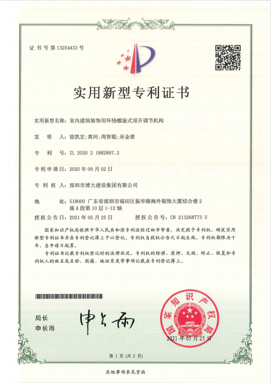 專利成果分別是《室內建筑裝飾用環繞螺旋式頂升調節機構》、《一種GRG吊頂安裝結構》、《一種PC預制混凝土構件下的特大推拉窗》、《一種帶有支撐構件的超大空間頂轉換層結構》、《一種單元拼接式鋁板吊頂或裝飾線條》等22項獲得由國家知識產權局頒發的專利證書。